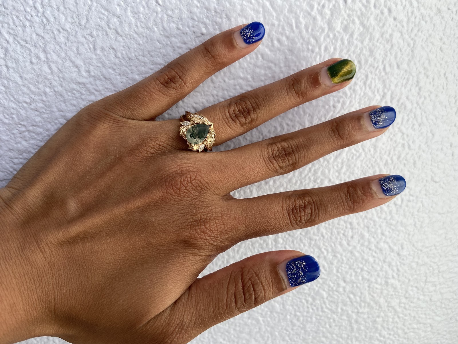 "Trina was phenomenal, and so patient as I flipped back and forth between multiple shades of blue. I came in to get my nails done for my engagement 💍 and I LOVED it! Here is the picture from the big day — and pictures from today, almost 3 weeks later! All 10 of the nails are still 100% intact!!! Thank you Trina!!!"